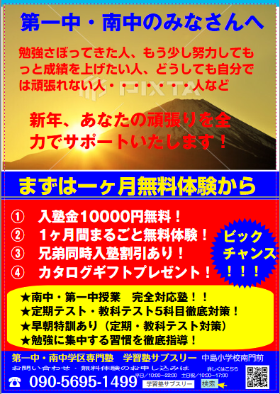 塾長梶谷が長年の経験・ノウハウをバシッと歯に衣着せぬトークで、第一中・南中学区の保護者様にお伝えします!必ずお役に立つ情報満載です!出し惜しみしません!もちろん参加されたからといって必ずしも入塾の必要もありません。